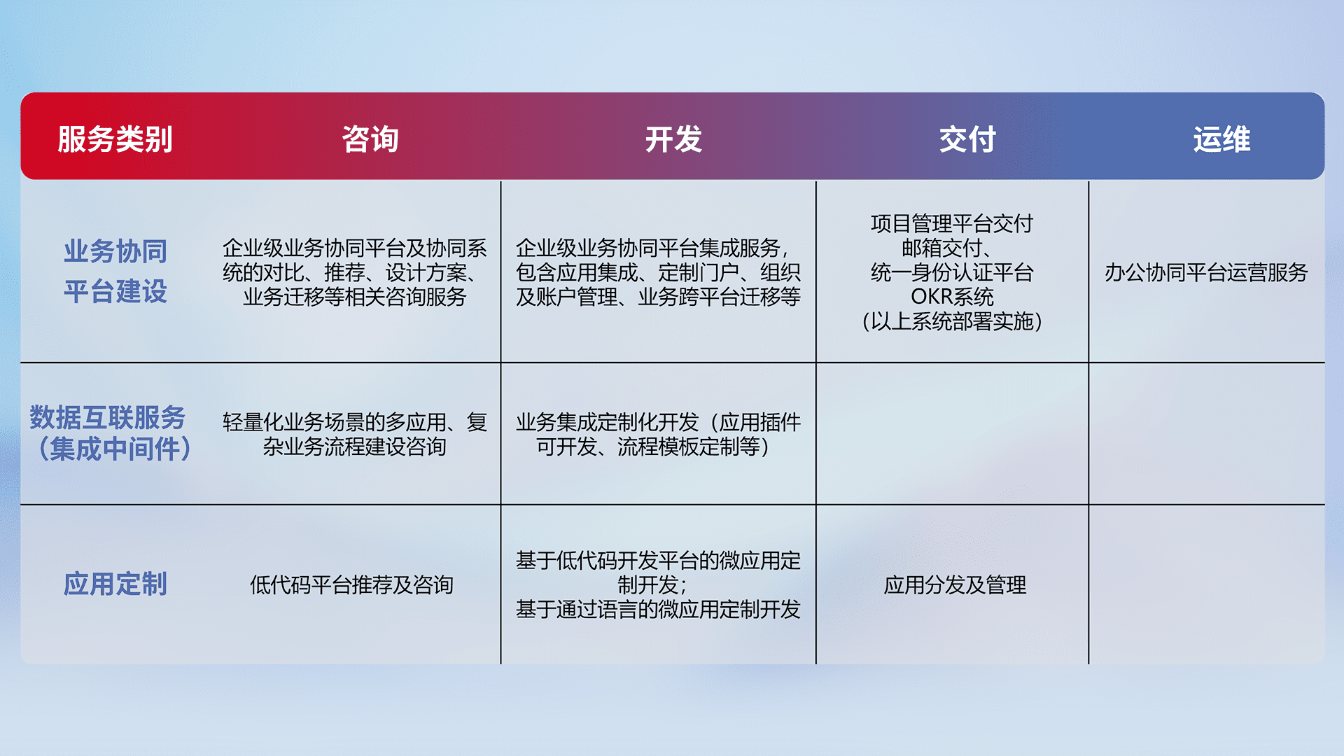 针对钉钉、、企微、、IDaas等平台级产品提供产品的规划、、、方案、、、交付、、定制化开发等服务,,,,实现如统一协同办公、、、智能客户服务、、、、混合会议管理、、、、智能数据查询、、、、等业务场景,,实现数字化转型。。。